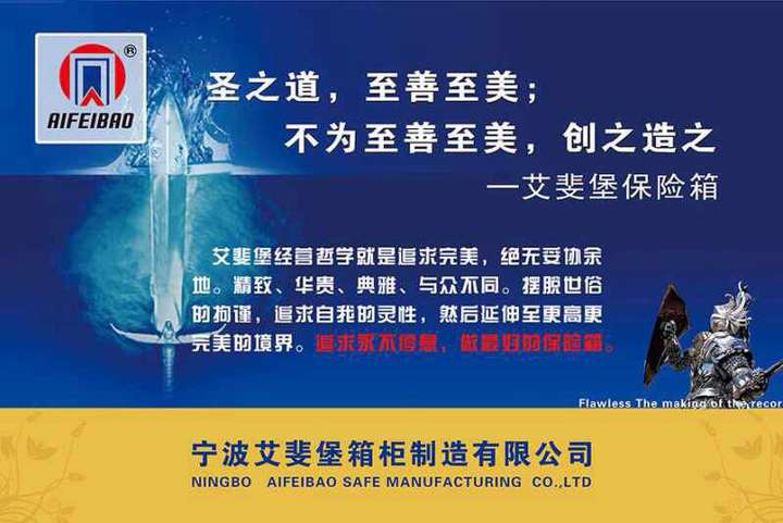 寧波艾斐堡(AIFEIBAO)保險箱柜制造有限公司,保 險箱(柜)*品牌、央視財經年度品牌戰略合作伙伴、寧波市知名商標、消費者信得過單位、消費者心目中 “頸力品牌”和“消費者喜愛品牌”、 專業防盜保險箱(柜)的實體安防生產企業。公司擁有多項*,現代化的機械加工設備、的生產工藝和極高的生產制作能力,產品廣泛應用于、財務、家庭、酒店、部隊支管理等諸多領域,并與國內、銀行、部隊、石油化工、移動通訊等產疑功合作,艾斐堡保 險箱(柜),“安全的港灣,幸福的發祥地”艾斐堡保險箱(柜)“為夢想而生,為成功而造”!